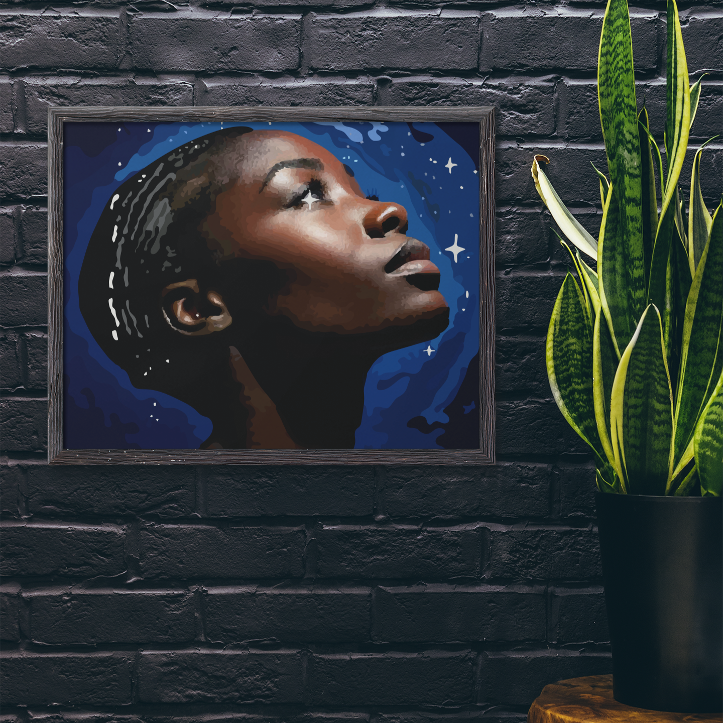 Transform your space with the FlyLoVve “In Her Eyes” Wall Art—a breathtaking tribute to Black beauty, strength, and infinite possibilities. This striking piece captures a close-up of a Black woman’s face, her gaze lifted toward the night sky, filled with hope, ambition, and wonder. Behind her, twinkling stars illuminate the darkness, symbolizing the boundless potential and cosmic energy within her spirit.