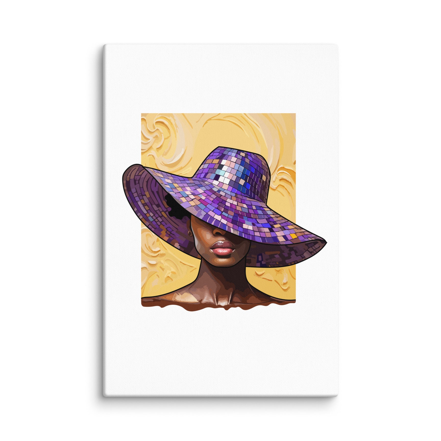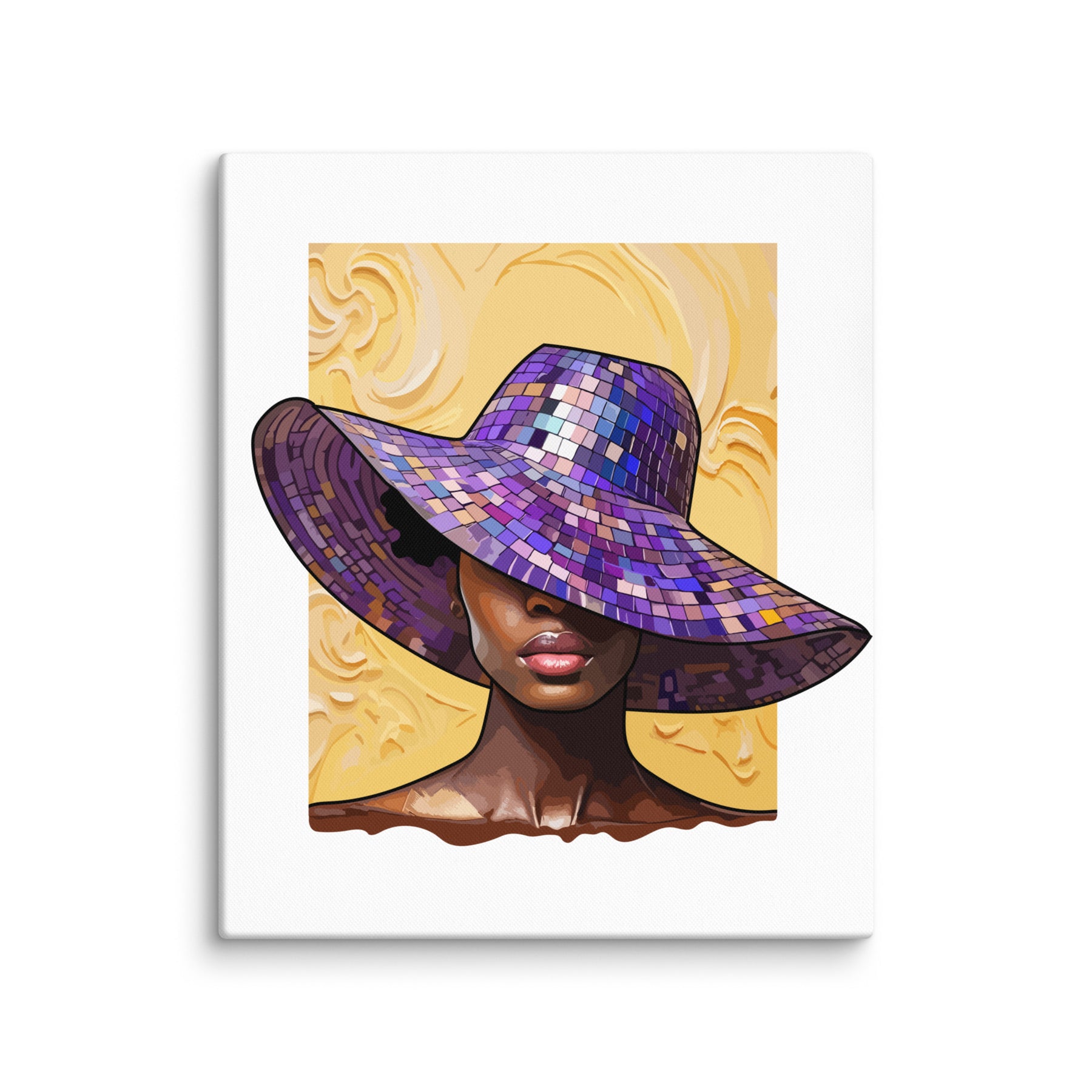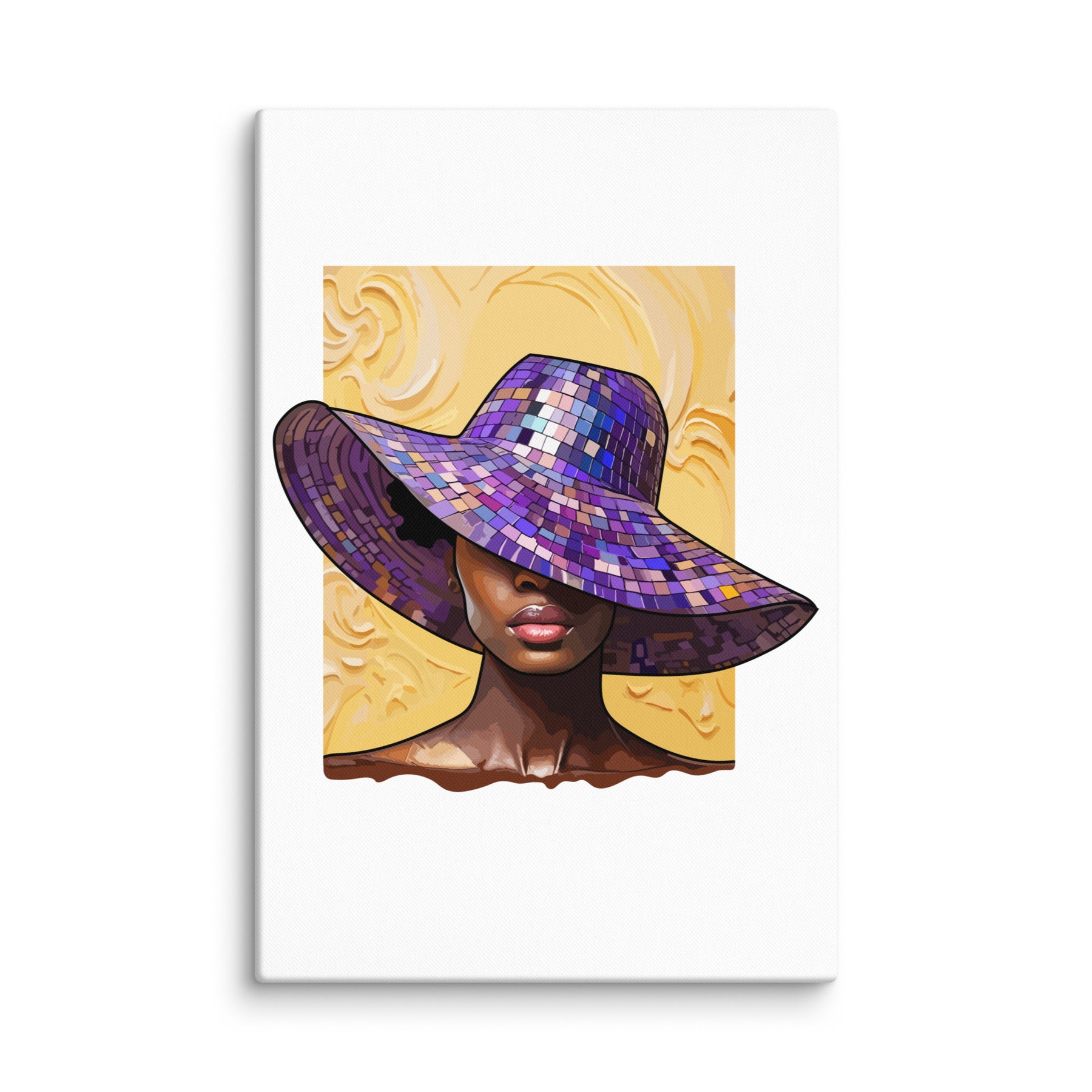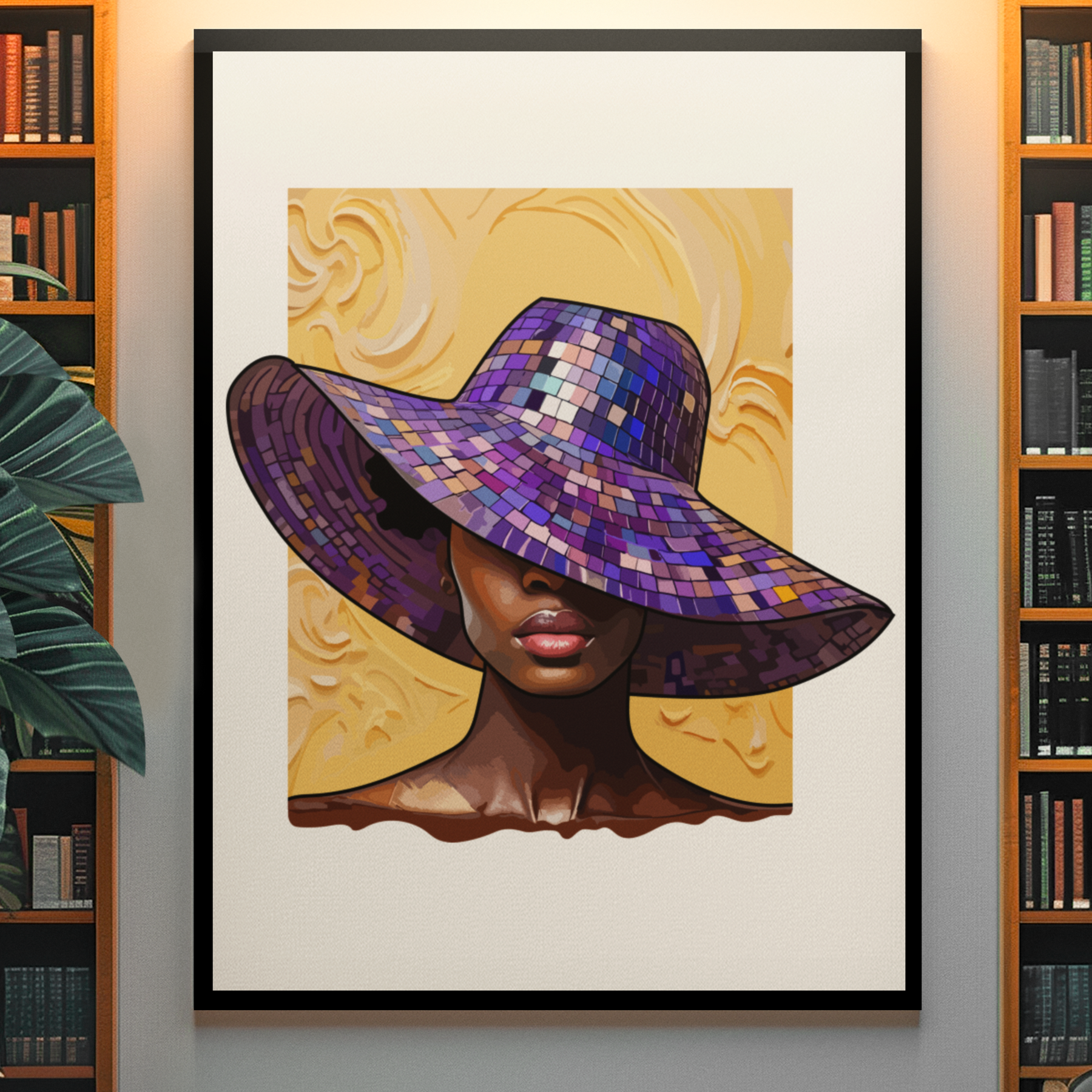 Step into the essence of elegance and cultural pride with our "Savannah" wall canvas, featuring a stunning design of a black woman adorned in a wide-brimmed mosaic-style purple hat. This unique piece captures the spirit of grace and strength, celebrating black heritage and fashion.