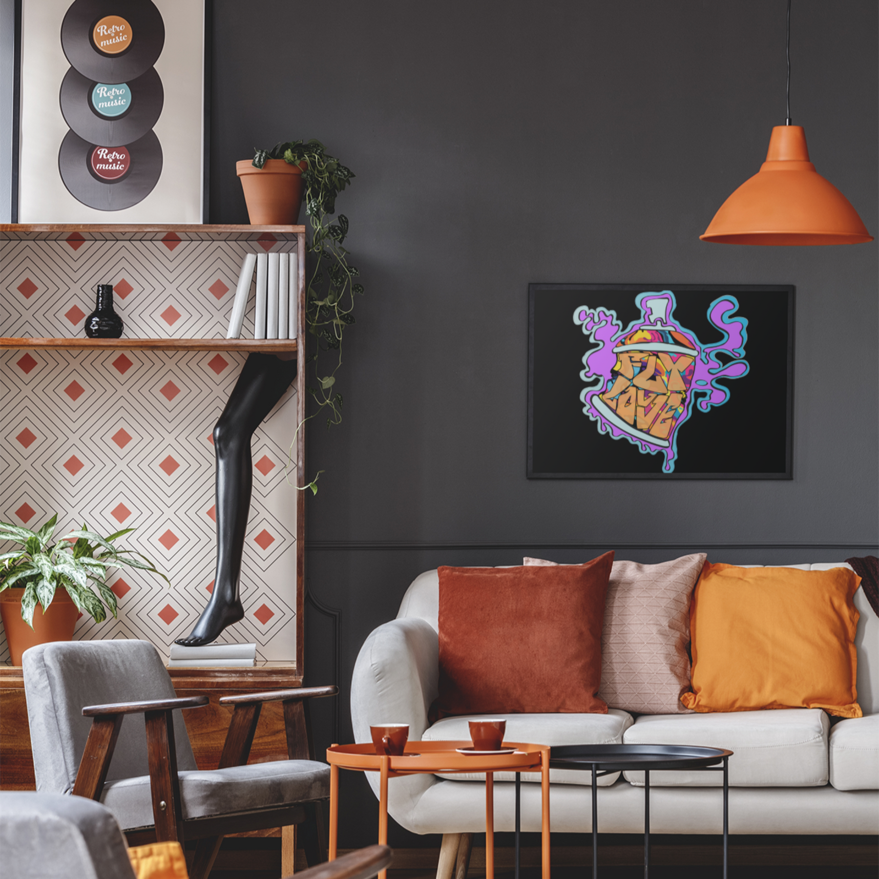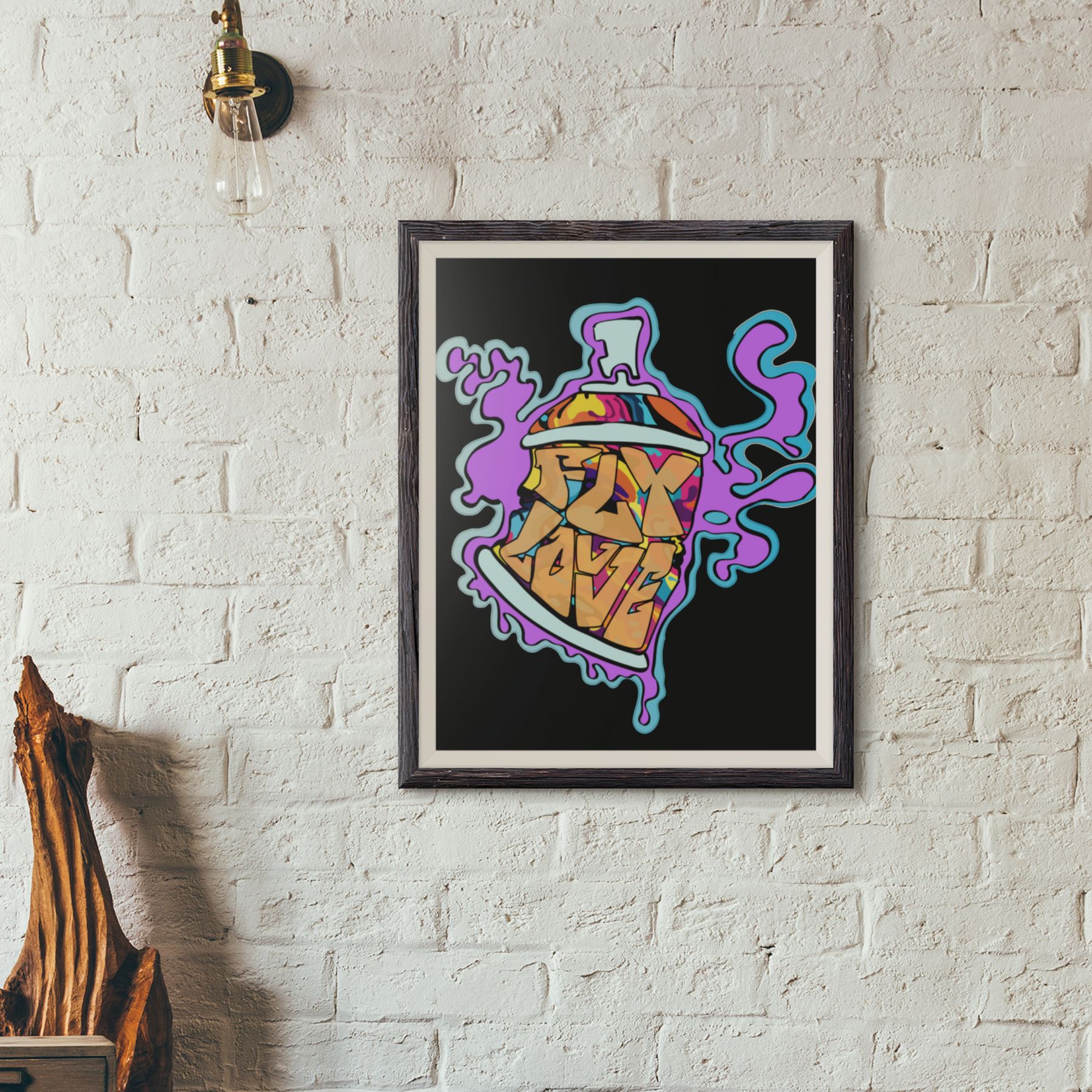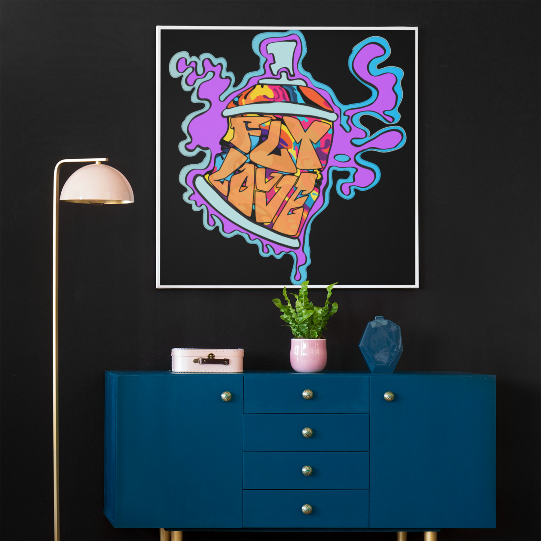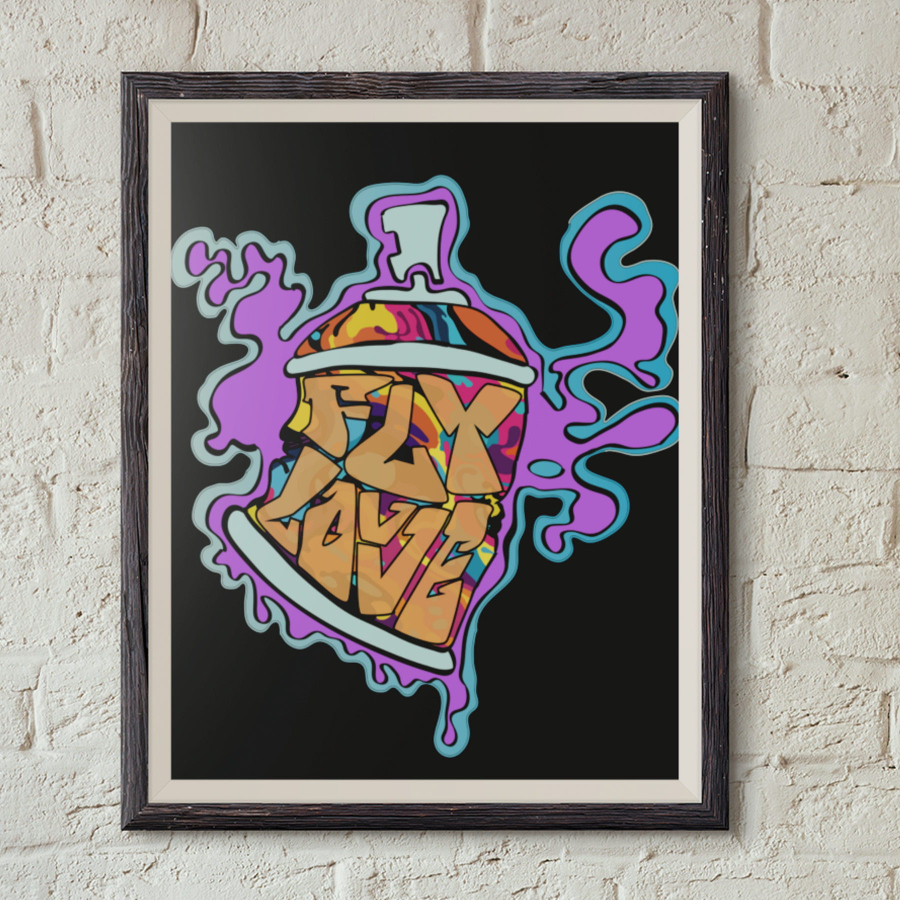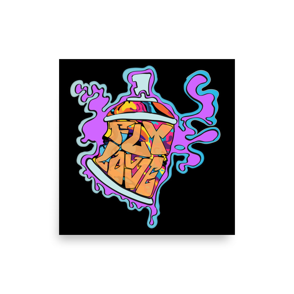 Bring an explosion of color and creativity to your space with the FlyLoVve Spray Paint Can Wall Art. This striking piece showcases a multi-colored animated spray paint can surrounded by a flowing purple paint spill, with the iconic FlyLoVve logo front and center. Printed on high-quality canvas, this artwork is perfect for adding a touch of urban energy to your home, studio, or office. A celebration of art and self-expression, it’s a bold statement for any wall.