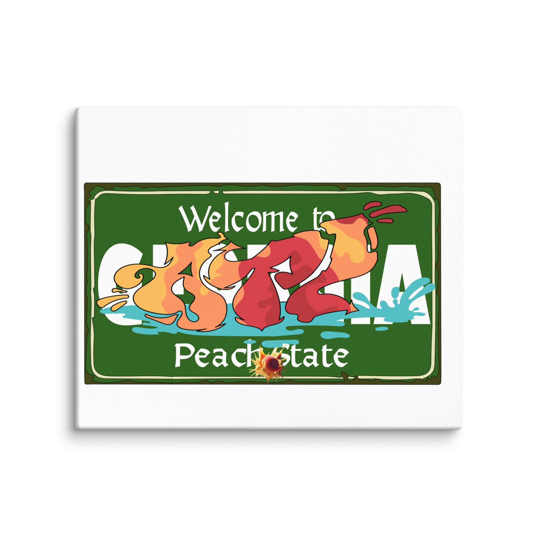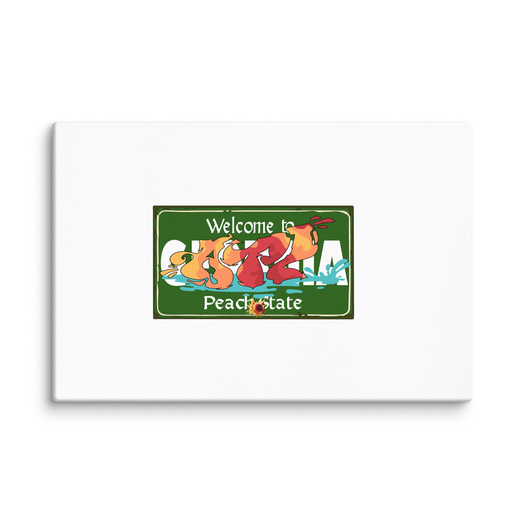 Bold, vibrant, and unapologetically Southern — this artwork reimagines the iconic Georgia welcome sign with a twist of urban edge and creative flair. At the heart of the design, the word “ATL” explodes in bold graffiti-style letters, drenched in fiery oranges, yellows, and reds that echo the heat and flavor of Atlanta’s streets and summer days.