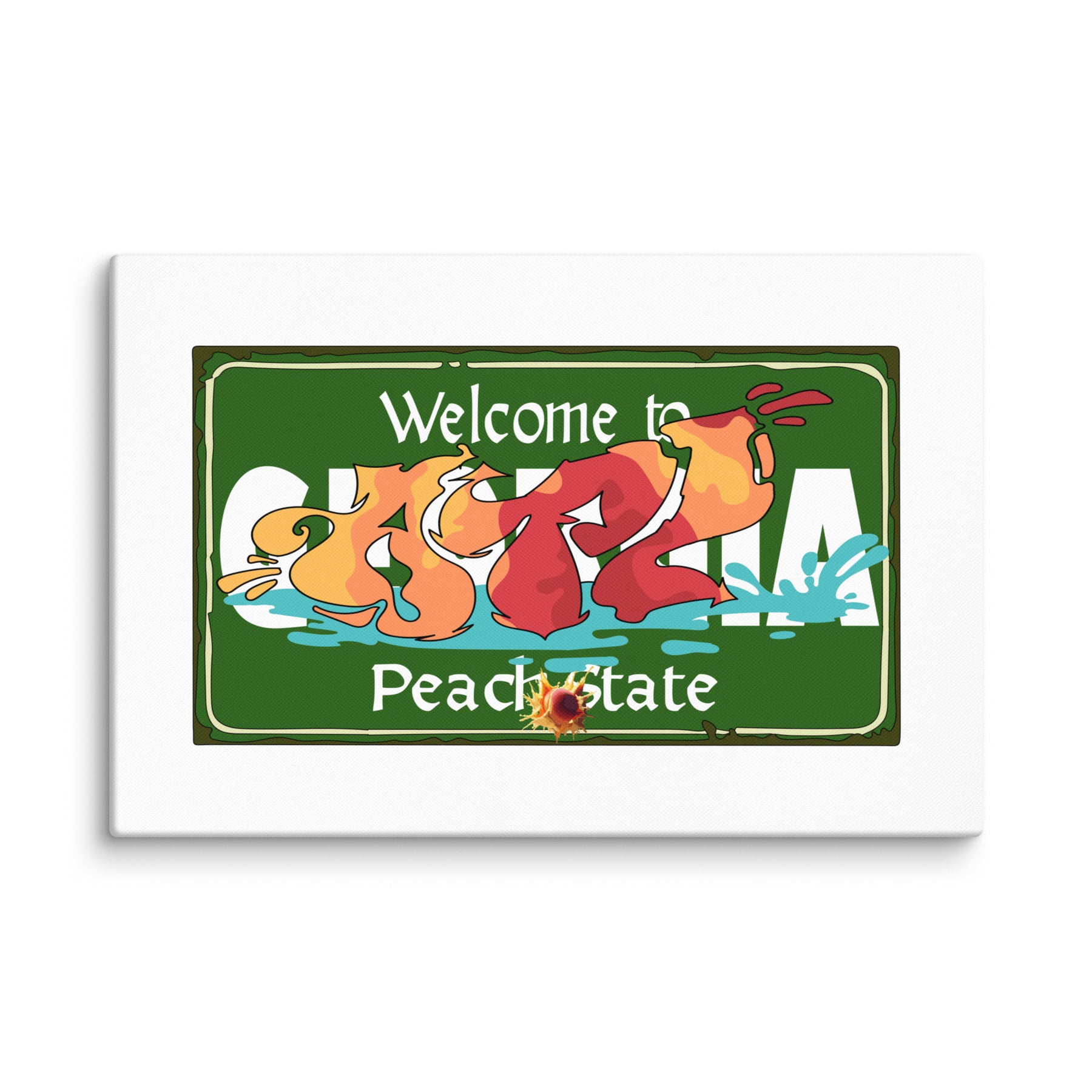 The letters drip with motion, splashing into cool blue water below, symbolizing the city’s rhythm, resilience, and refreshing soul. Behind it, the traditional green highway sign grounds the piece, declaring "Welcome to Georgia – Peach State" in crisp white type. A juicy peach splatter at the bottom seals the Southern vibe with a playful nod to Georgia’s signature fruit.