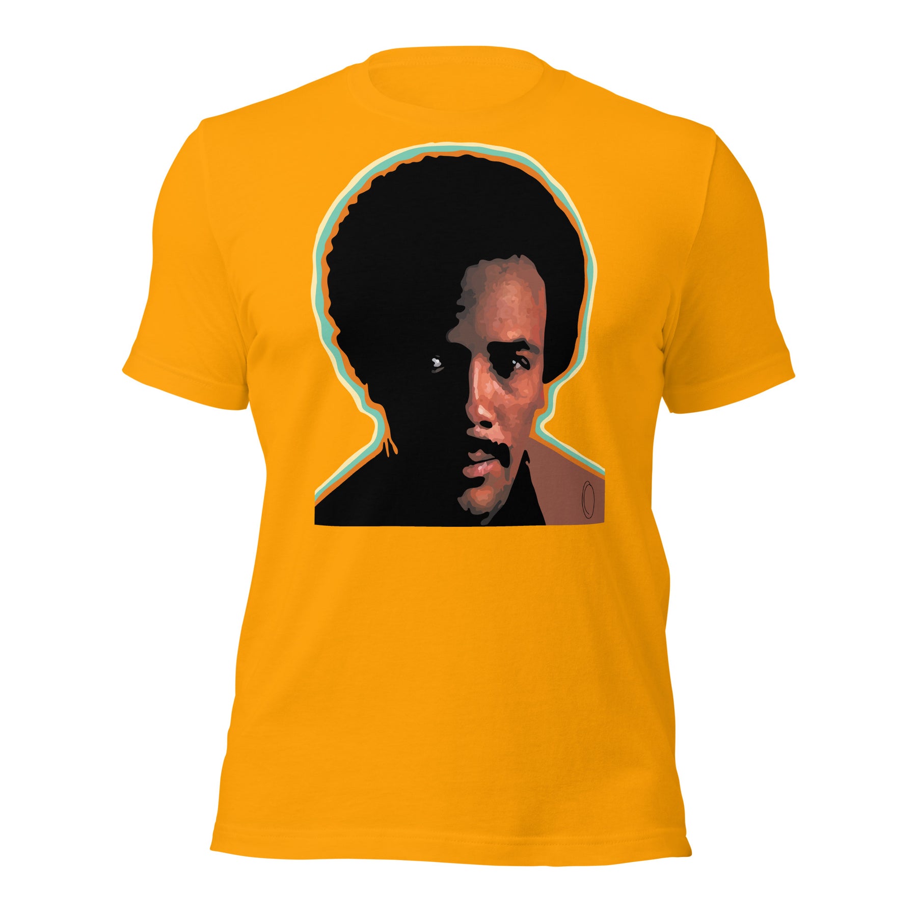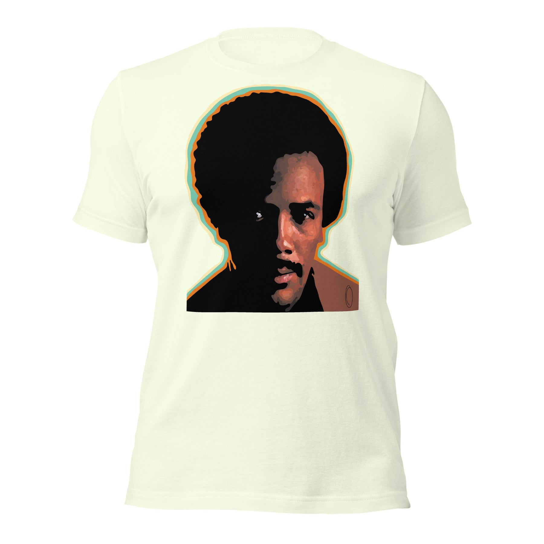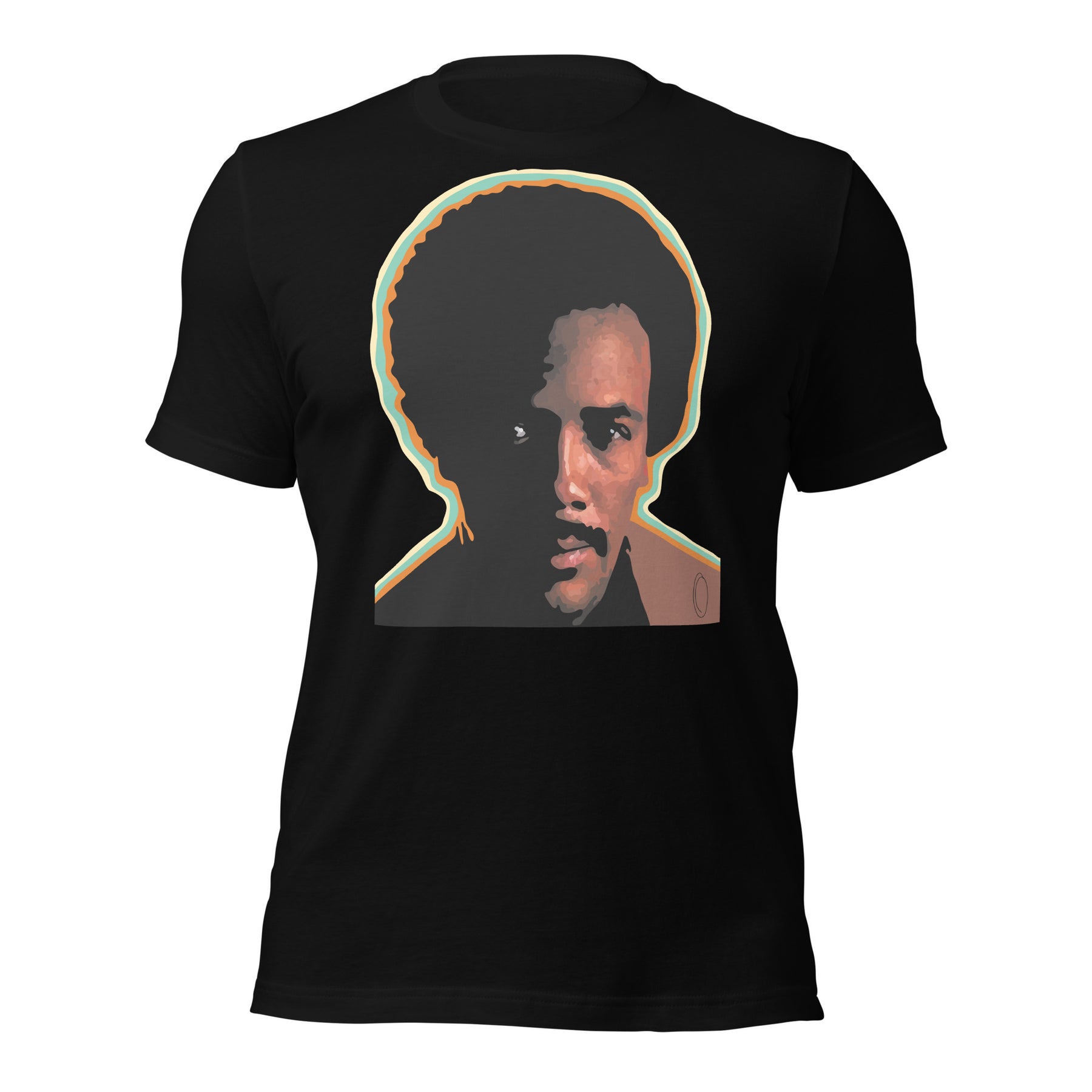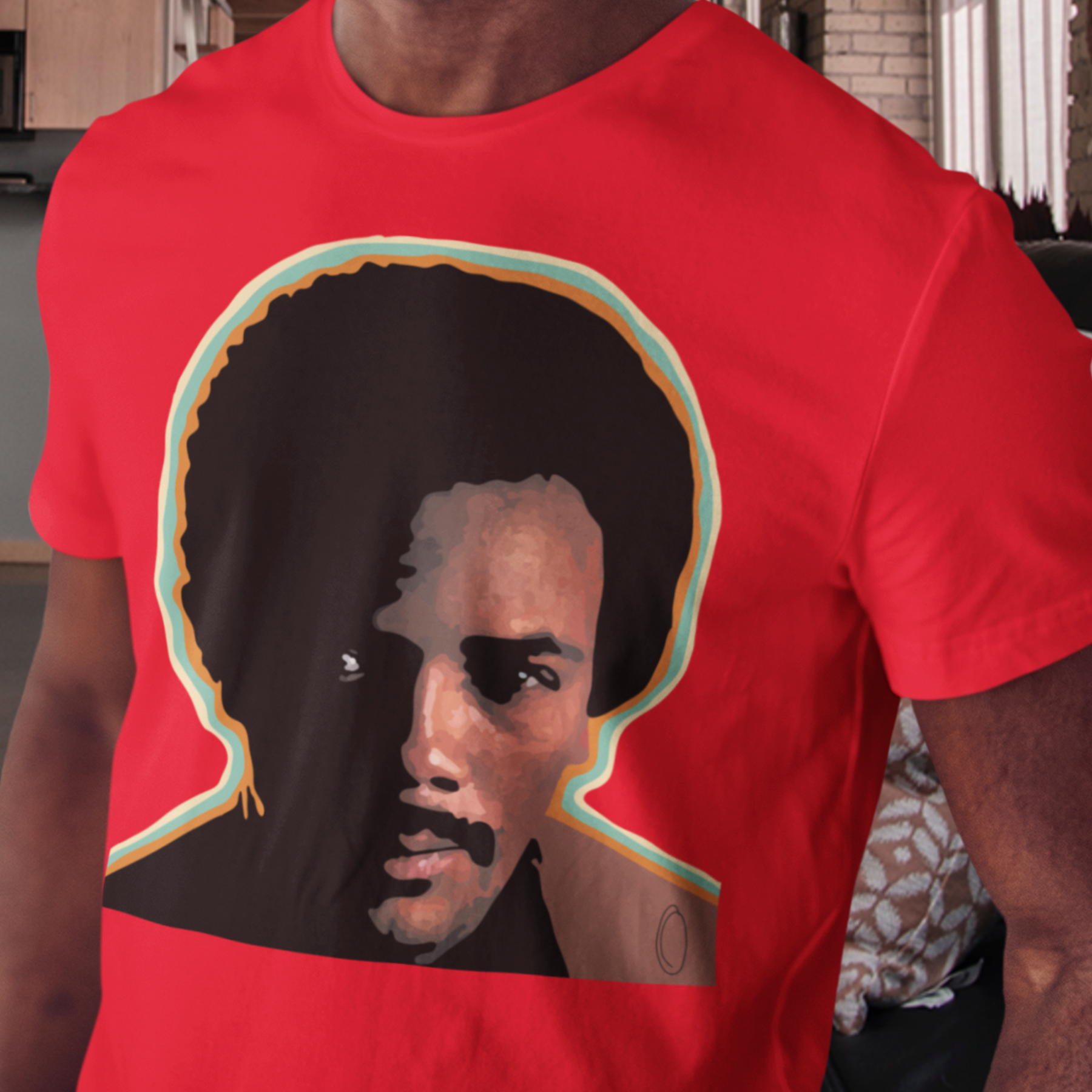 Celebrate a musical genius with this exclusive Quincy Jones t-shirt. Featuring a young Quincy, afro and all, with his iconic 'Q' signature in the corner, this design captures his charm and legacy. Outlined in bold, 70s-inspired colors, this portrait exudes vintage vibes and timeless style, perfect for fans of music history and retro fashion. Made with premium, soft fabric, this FlyLoVve t-shirt is a comfortable and stylish way to keep Quincy’s spirit close, wherever you go.