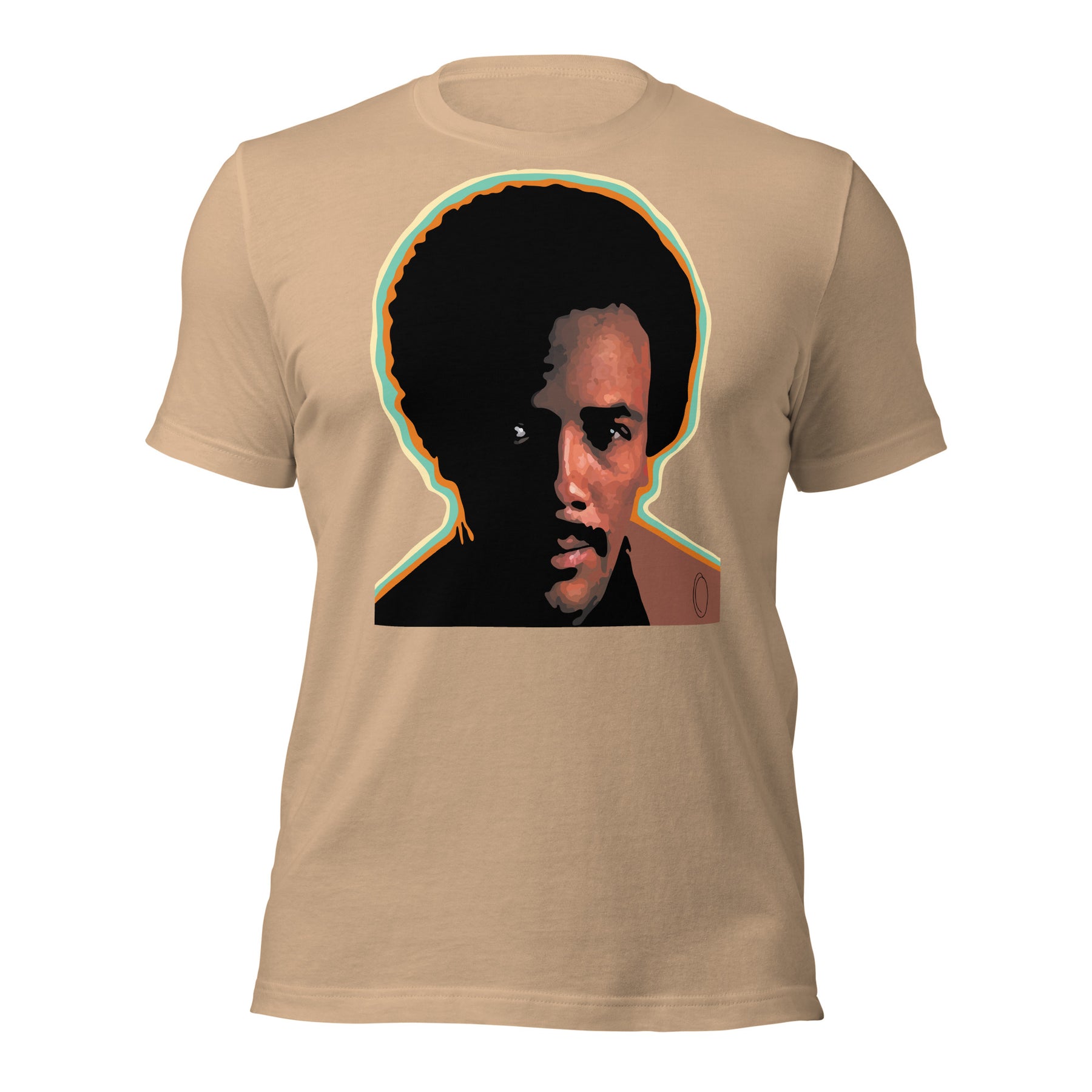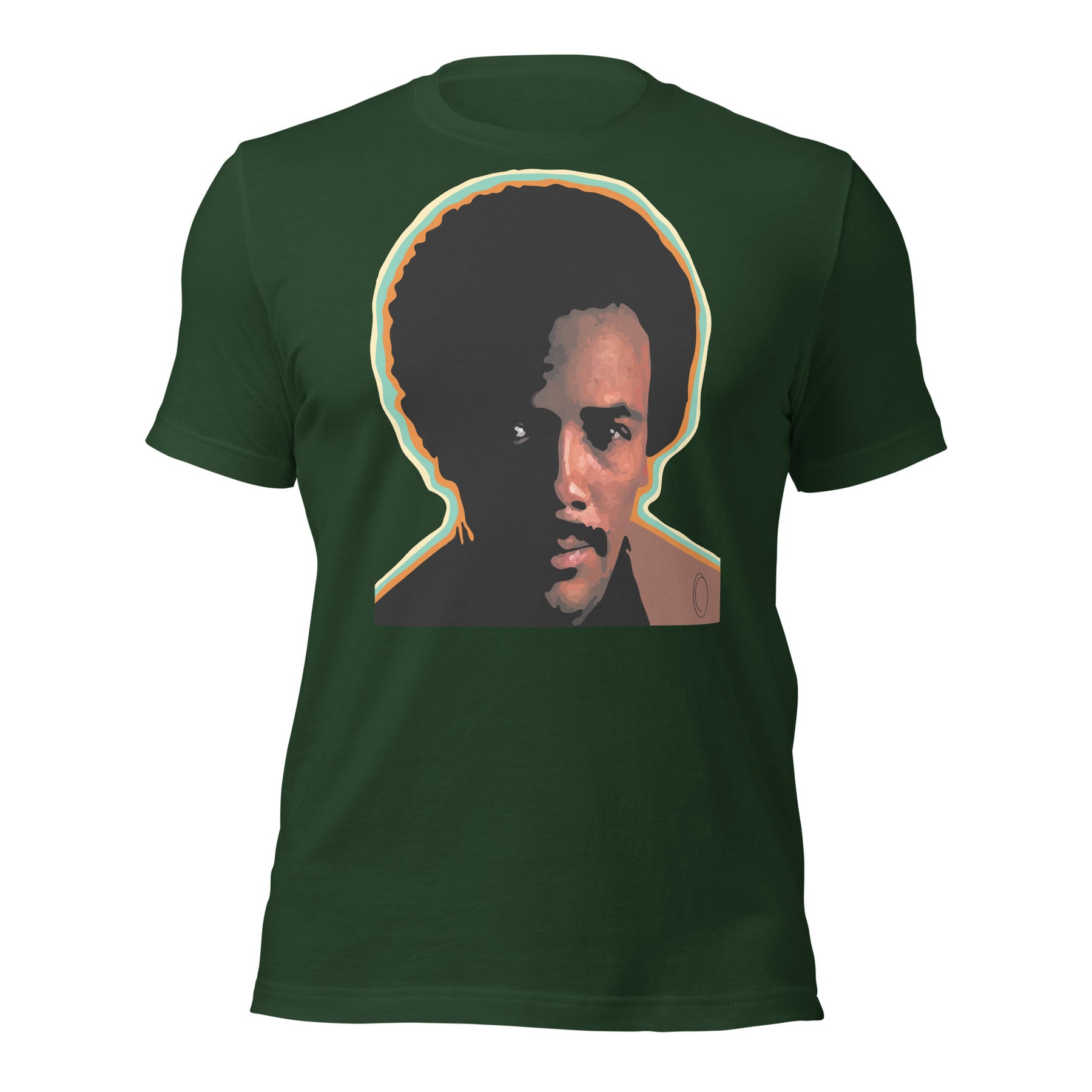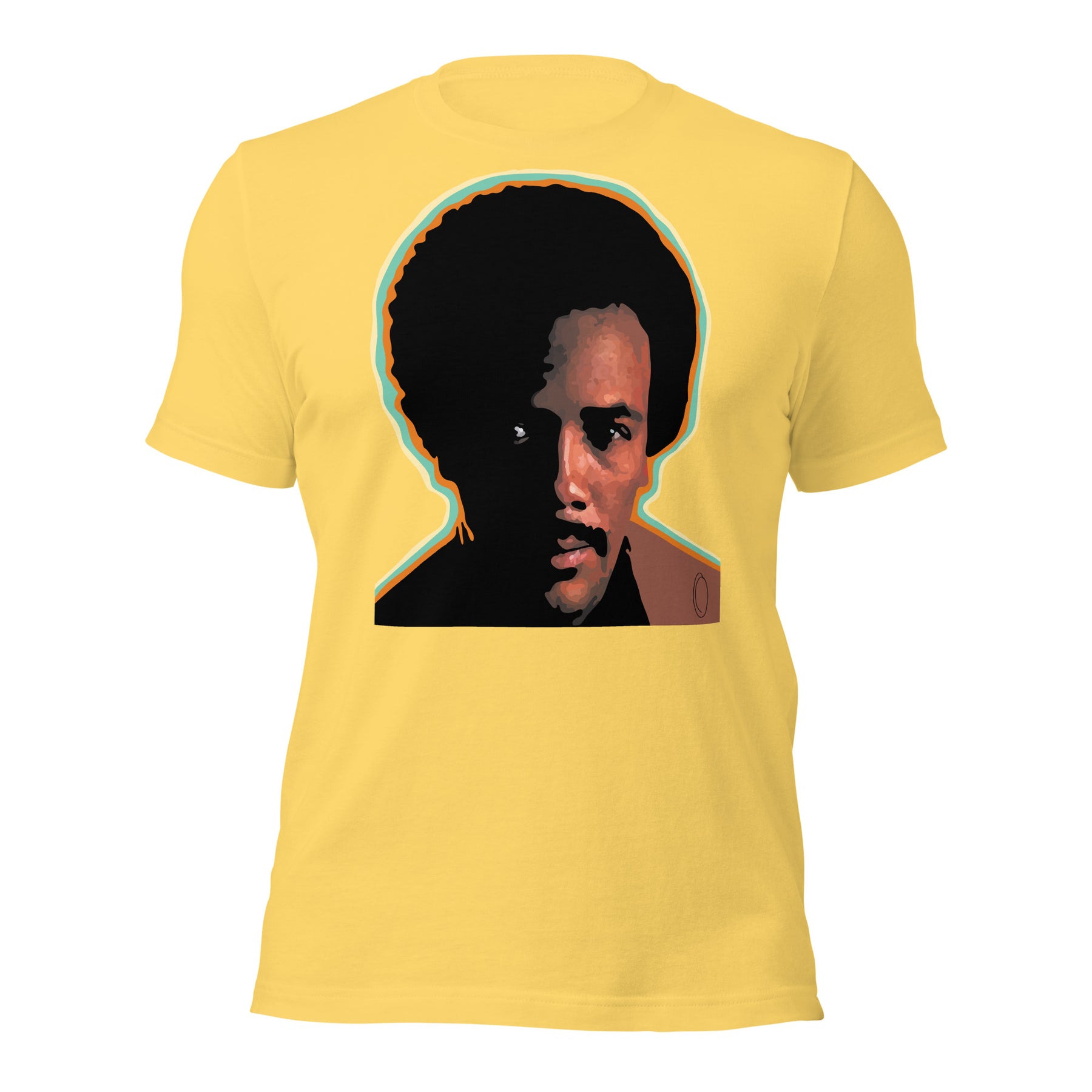 Celebrate a musical genius with this exclusive Quincy Jones t-shirt. Featuring a young Quincy, afro and all, with his iconic 'Q' signature in the corner, this design captures his charm and legacy. Outlined in bold, 70s-inspired colors, this portrait exudes vintage vibes and timeless style, perfect for fans of music history and retro fashion. Made with premium, soft fabric, this FlyLoVve t-shirt is a comfortable and stylish way to keep Quincy’s spirit close, wherever you go.