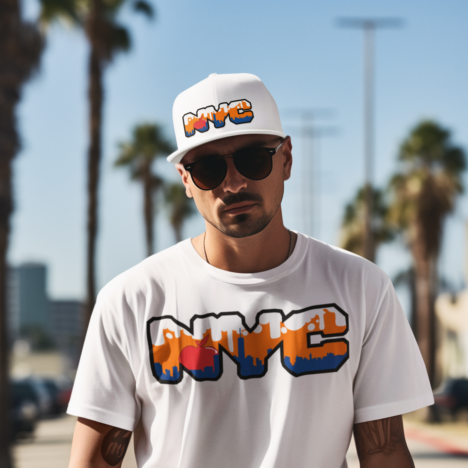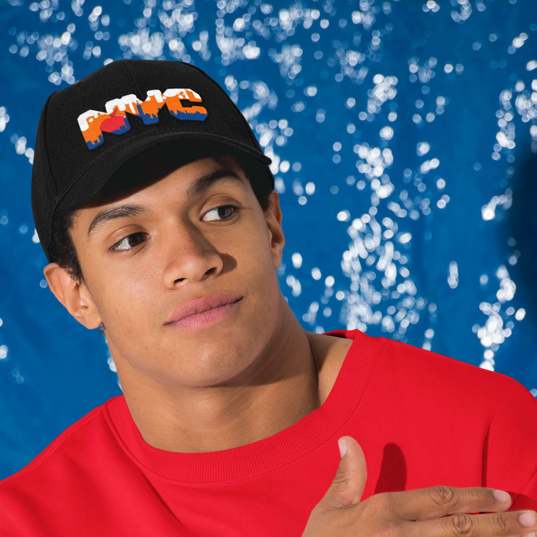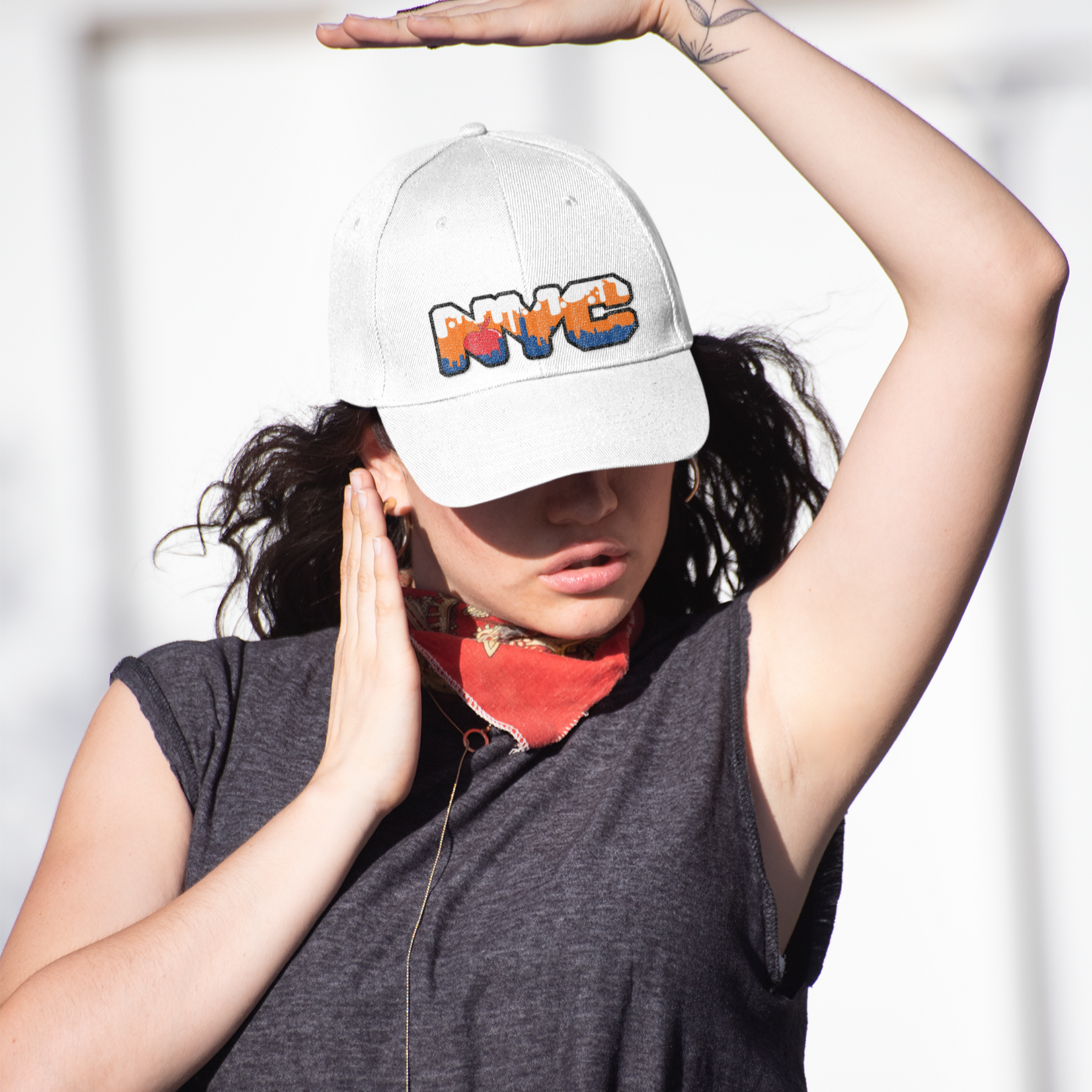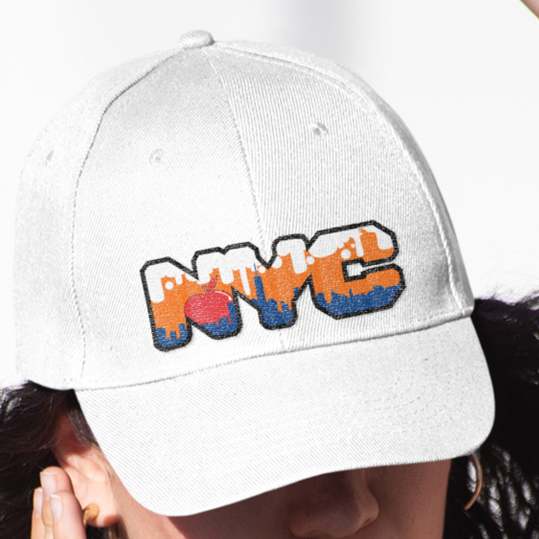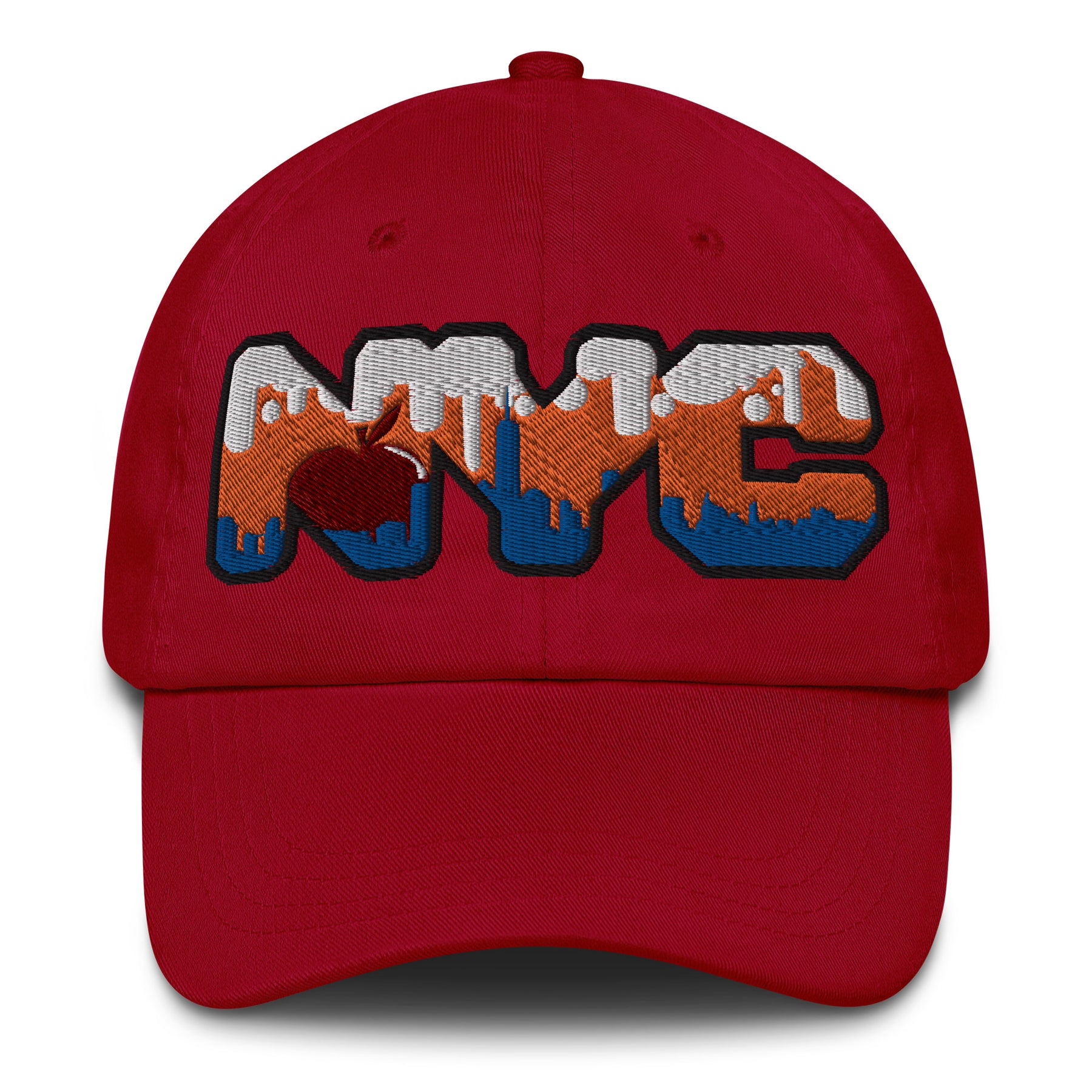 Top off your look with a touch of New York pride in our NYC Skyline Dad Cap. Featuring "NYC" in a bold, blocky font, the cap brings the iconic New York skyline to life inside the letters. The buildings are shaded in a striking blue, set against an orange sky with fluffy white clouds. Adding a playful element, a big red apple peeks out from behind the buildings, nodding to New York's legendary nickname, "The Big Apple."