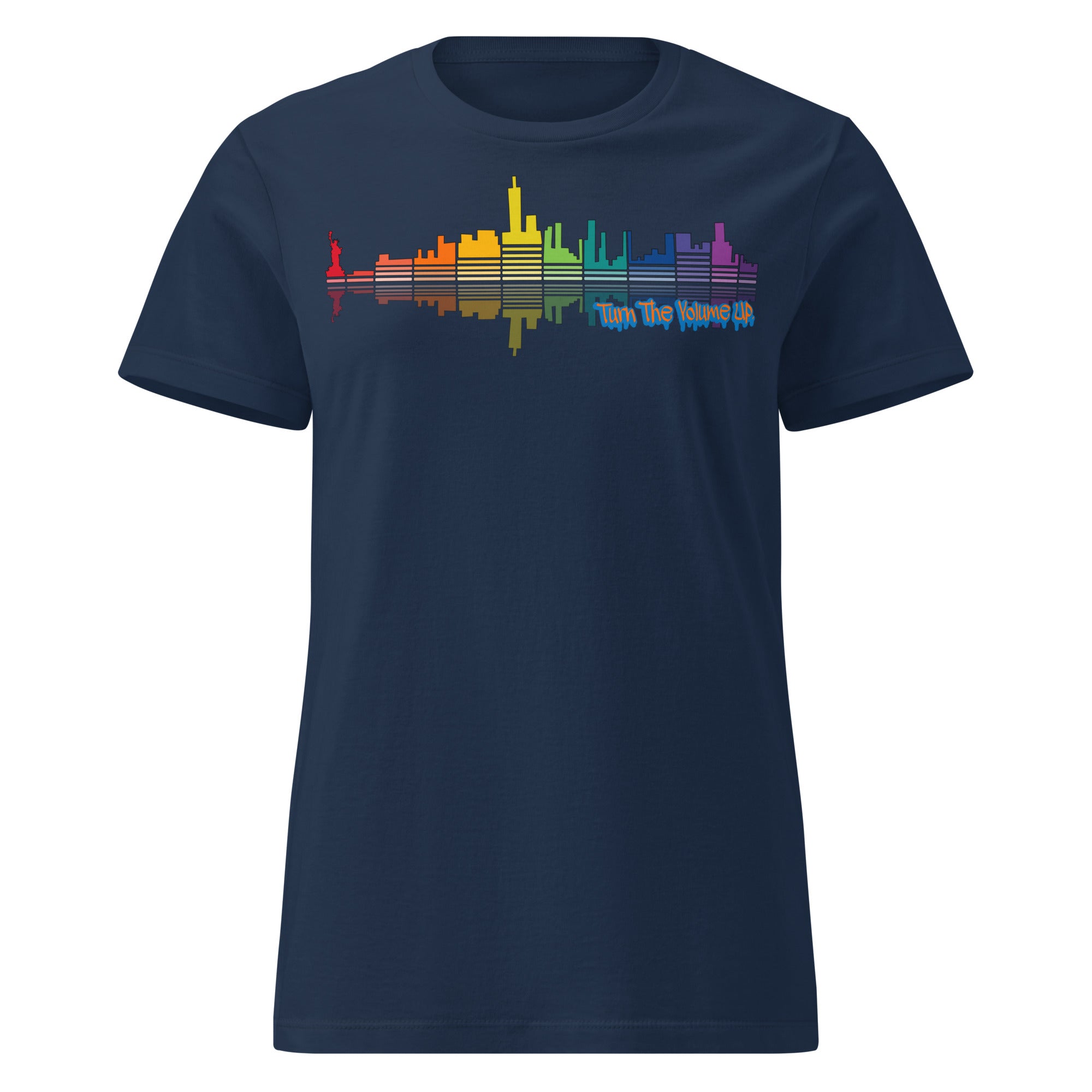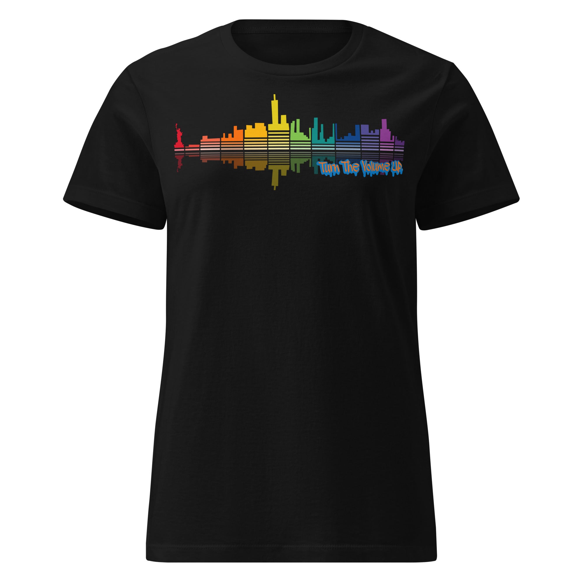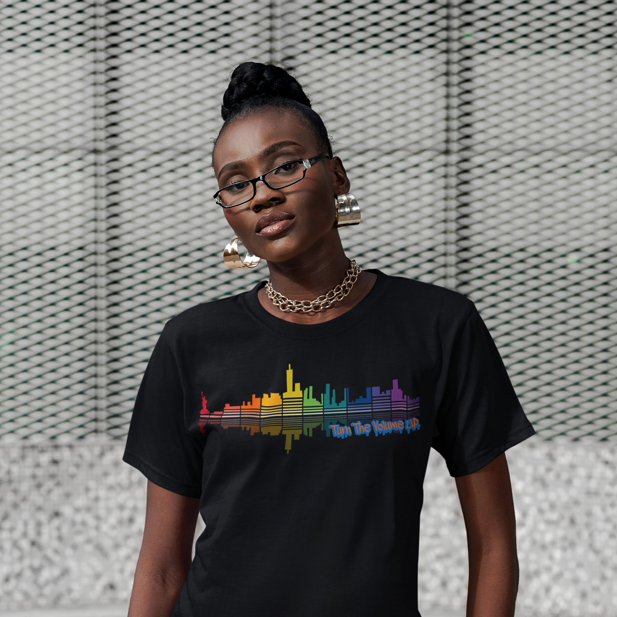 Crank up your style and make a statement. This tee features the vibrant rainbow skyline of New York City shaped like a soundwave — a graphic echo of the iconic moment when Zohran Mamdani addressed the city and the nation: “Donald Trump, since I know you’re watching… turn the volume up.”